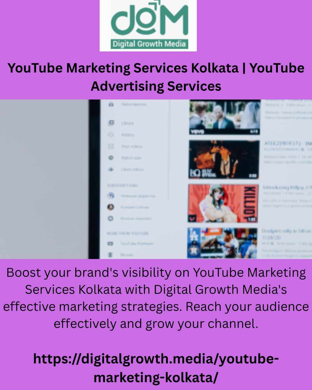 Boost your brand's visibility on YouTube Marketing Services Kolkata with Digital Growth Media's effective marketing strategies. Reach your audience effectively and grow your channel.